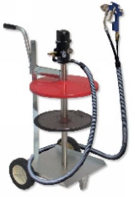 用于将装满黄油的黄油桶放在车上,安装好气压泵,将车推到工作区域;用喷枪大面积均匀喷涂黄油润滑脂,喷涂速度2公斤/分;最大输出气压425巴,喷枪压力5巴,供货时不带黄油桶,直接使用黄油包装桶,带车;
