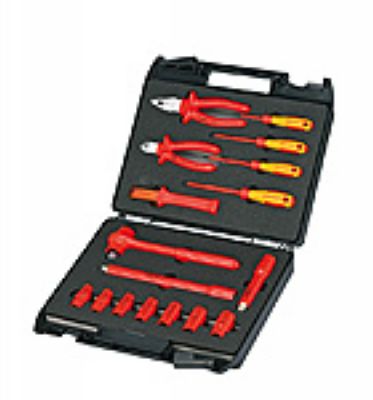 采用耐冲击塑料箱体;箱内工具货号:03 07 200 电工绝缘钢丝钳、70 07 160 电工绝缘斜嘴钳、98 20 35 一字绝缘螺丝批、98 20 40 一字绝缘螺丝批、98 20 55 一字绝缘螺丝批、98 24 00 十字绝缘螺丝批、98 42 电工绝缘棘轮扳手、98 45 125 电工绝缘接杆、98 45 250 电工绝缘接杆、98 47 10 电工绝缘六角套筒、98 47 11 电工绝缘六角套筒、98 47 12 电工绝缘六角套筒、98 47 13 电工绝缘六角套筒、98 47 14 电工绝缘