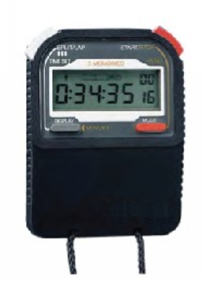 符合人体工程学设计,坚固的防水塑料外壳, 配有系索和保护袋,LCD屏幕清晰显示, 开始/停止/重制/叠加/分拆/多重测量, 附件带有1.5V电池和使用说明书。 附加功能:存储5个分段时间,一天的时间。